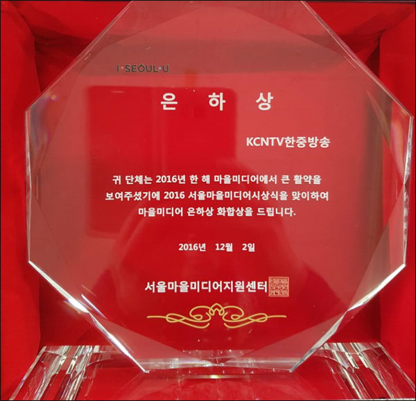 12월 2일 저녁 7시 서울 마포구 홍대입구역 인근 미디어카페 후에서 열린 '2016 서울미디어축제" 서울마을미디어 시상식에서 KCNTV한중방송이 마을미디어 단체상인 은하상-화합상을 수상했다.