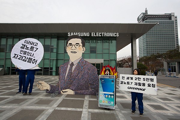 이날 그린피스 활동가들은 수원에 위치한 삼성전자 본사 앞에 권오현 삼성전자 대표의 얼굴을 형상화한 대형 조형물을 설치하고, 그 옆에서 갤럭시노트7이 폭발하는 모습과 사고 이후 기기에 사용된 자원들이 재활용되는 상황 등을 차례로 연출했다.