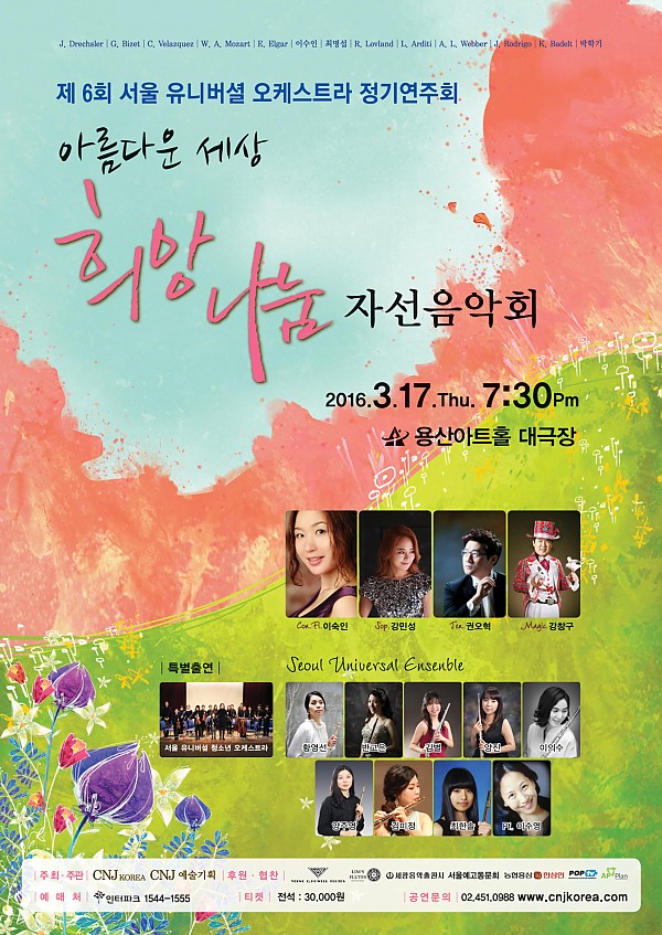 이번 자선음악회는 ‘제 6회 서울 유니버셜 오케스트라 정기연주회’ 로서 경제적, 문화적으로 소외된 이웃들을 초청하여 음악을 통해서 아름다운 세상을 위한 ‘희망’을 나누는 감동이 있는 소중한 시간이 될 것이다.