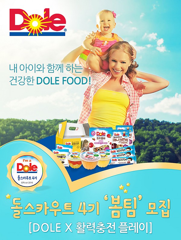 ‘돌 스카우트’ 지난 2013년부터 기수제로 운영해온 서포터즈로 참가자는 약 3개월동안 돌(Dole) 푸드의 다양한 신제품을 체험해 볼 수 있는 기회를 제공받고, 미션 주제에 맞는 여러 활동을 진행하게 된다. 이번에 모집하는 4기 봄 팀은 개인 블로그와 SNS 채널을 활발하게 운영하며 성장기 자녀를 둔 주부라면 누구나 지원이 가능하다. 서포터즈에게는 소정의 활동비가 지급되며, 3개월 활동 이후 우수 활동자를 선별하여 돌의 특별한 기프트 세트를 추가로 제공할 예정이다.