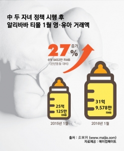 중국 두 자녀 정책 시행으로 국내 영·유아 업계 중소기업들의 중국진출에 청신호가 켜졌다. 알리바바 공식 파트너사인 에이컴메이트가 2016년 1월 1일부터 31일까지 한 달간 알리바바 티몰 영·유아(母婴) 카테고리 거래액을 분석한 결과 전년 동월 대비 27% 상승한 것으로 나타났다.