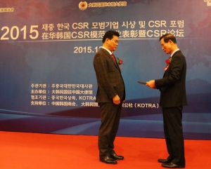 주중한국대사관이 주관하고 코트라, 주중한국상회가 지원하는 ‘2015 재중 한국 CSR 모범기업 평가’에서 세라젬(고객만족), 삼성(우수전략), 현대차(지역공헌), CJ(창조혁신) 등 4개사가 분야별 최우수상을 받았다. 한편 세라젬이 최우수상의 영예를 안은 고객만족 부문에서는 LG화학, 아모레퍼시픽, 한진해운 등 대기업이 우수상을 받았다.