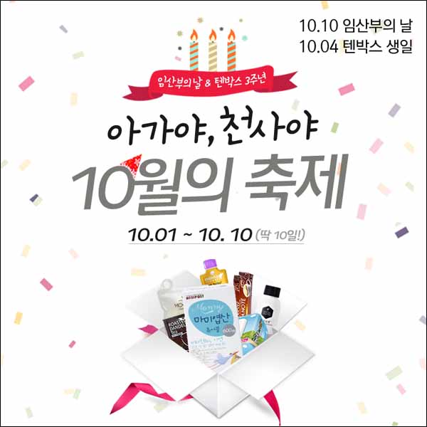 임신태교 전문쇼핑몰 텐박스와 바이오 기업 메디포스트가 임산부의 날을 맞아 공동으로 10월 1일부터 10일까지 임산부 200명을 추첨하여 임신축하팩을 무료로 증정하는 이벤트를 실시한다.