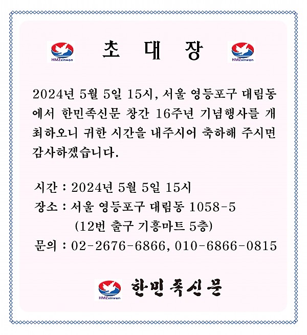 그동안 중국동포들의 한국생활을 위주로 정치, 경제, 문화, 스포츠생활 등 다방면의 내용으로 꾸려졌던 한민족신문은 16년간 꾸준히 동포사회의 희로애락을 전달하면서 자신의 본분을 지켜왔다. 이처럼 역경을 이겨내고 성장해온 한민족신문은 창간 16주년을 기념하여 오는 5월 5일 오후 3시, 서울시 영등포구 대림동에서 창간 16주년 기념 축하행사를 개최할 예정이다.