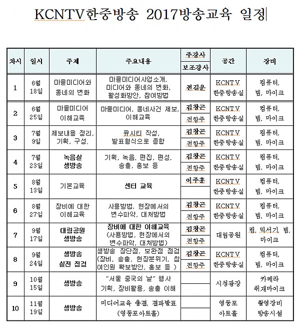 KCNTV한중방송은 지난해 서울시 마을미디어지원센터에서 조직한 방송시합에서 유일한 중국동포방송팀으로 참여해 우수상을 받았으며 연말 총결에서는 우수단체로 선정되어 표창을 받기도 했습니다. 올해도 KCNTV한중방송은 더욱 활발하고 정규적인 방송으로 거듭나며 재한중국동포들의 희로애락을 잘 반영하면서 동포들의 끼와 재능을 발휘할 수 있도록 하기 위하여 아래와 같이 교육을 진행하고자 하오니 적극적인 참여를 부탁합니다.