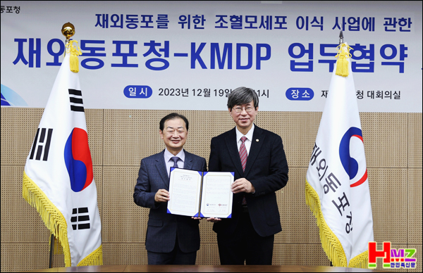 사단법인 한국조혈모세포은행협회(회장 : 신희영, 이하 KMDP)는 재외동포청(청장 : 이기철)과 조혈모세포 이식 홍보사업을 위한 업무협약(MOU)을 체결했다. 이번 협약식은 19일 오전 인천 연수구 소재 재외동포청 대회의실에서 이뤄졌다.